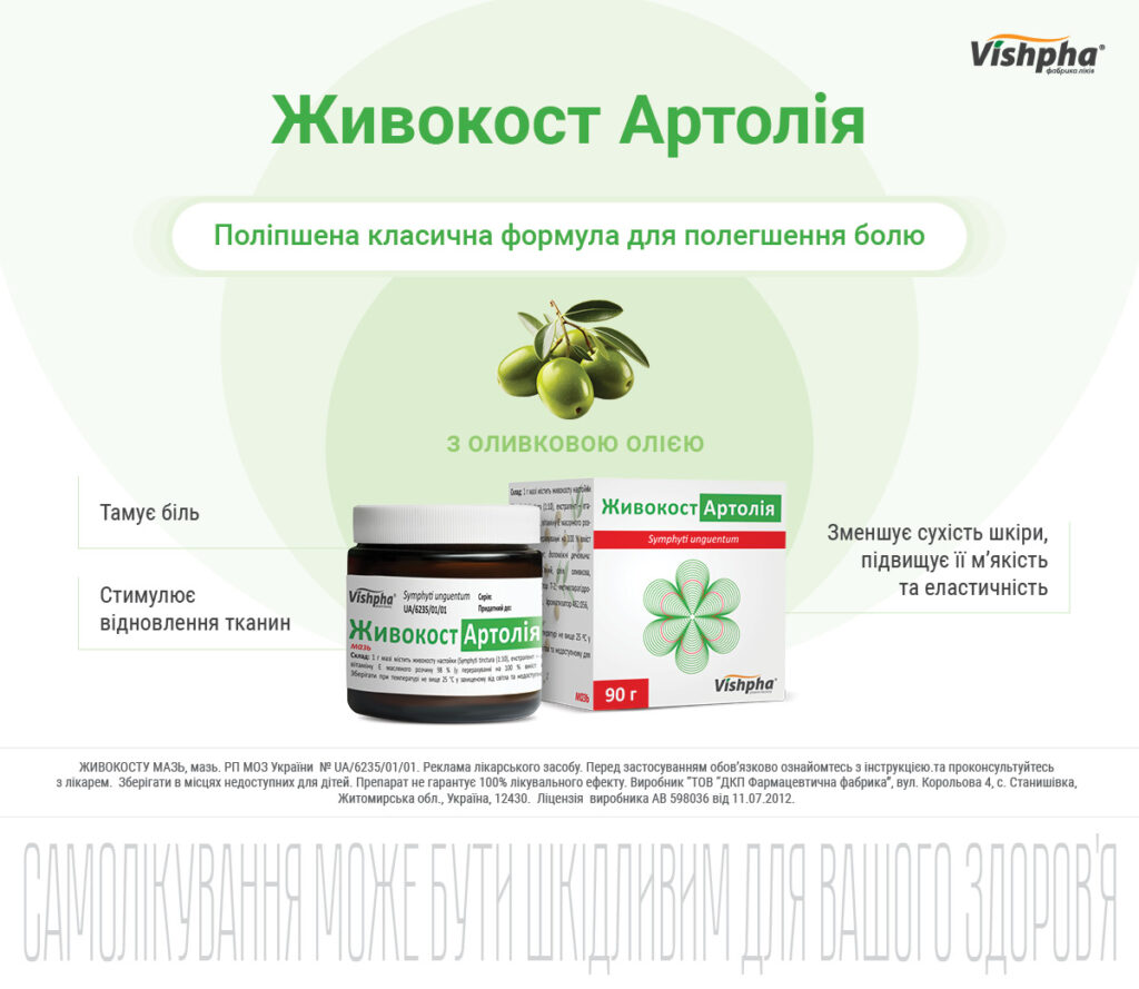 Навіть на незначні больові симптоми потрібно звертати увагу, якщо є ризик появи артралгії. Не варто чекати, що біль, який з’явився в суглобі, пройде так само раптово, як і з’явився. Досить часто для полегшення стану застосовується такий препарат, як мазь Живокост Артолія. Вона є сучасним засобом, який має у складі оливкову олію, настоянку живокосту, гліцерин, вітамін Е, парафін. Використання натурального препарату дозволяється після досягнення 18 років.